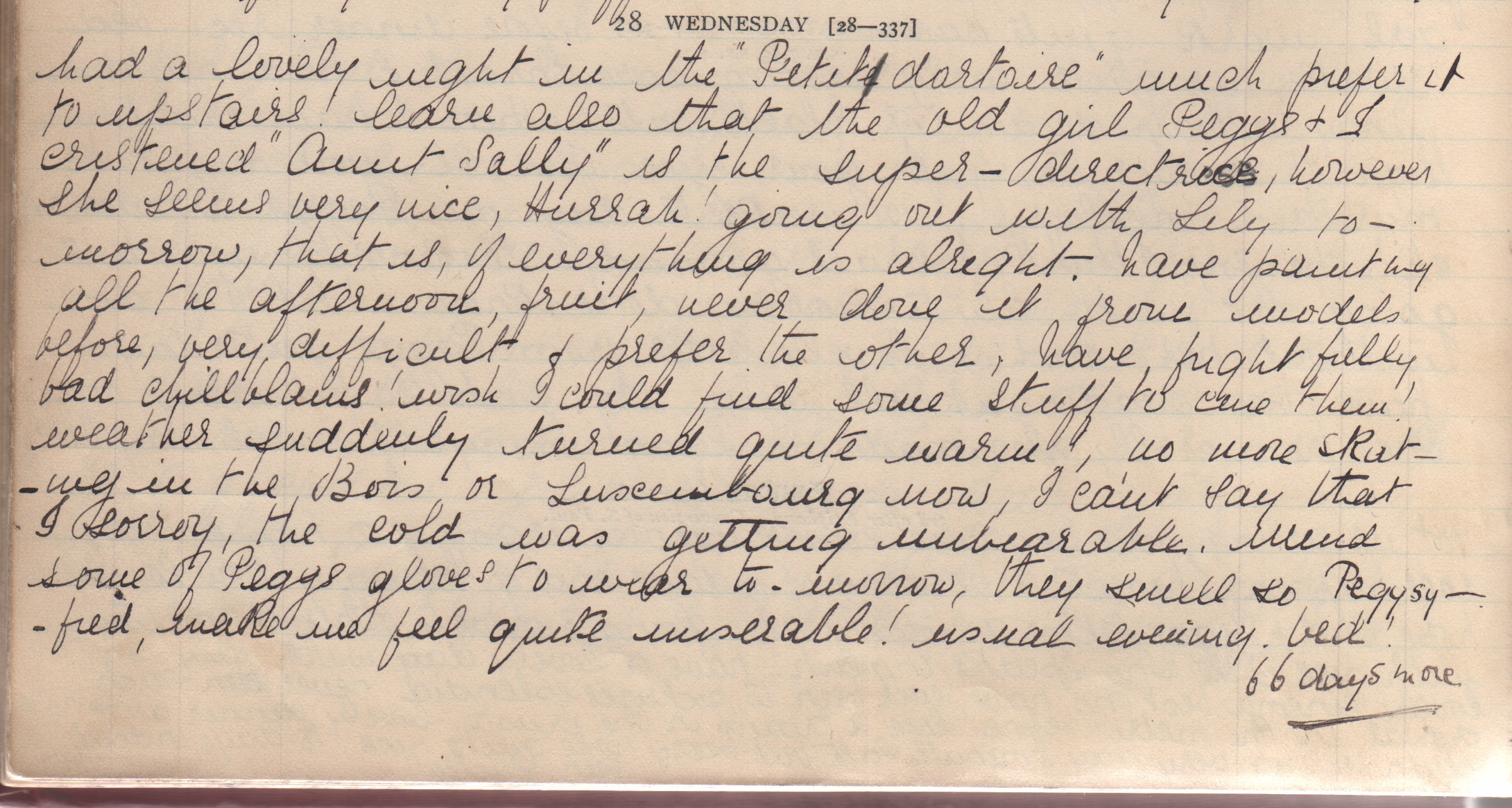had a lovely night in the “Petit dortoire” much prefer it to upstairs, learn also that the old girl Peggs + I christened “Aunt Sally” is the super-directrice, however she seems very nice, Hurrah! going out with Lily to-morrow, that is, if everything is alright. have painting all the afternoon, fruit, never done it from models before, very difficult + prefer the other, have frightfully bad chillblains! wish I could find some stuff to cure them! weather suddenly turned quite warm, no more skating in the Bois or Luxembourg now, I can’t say that I sorry, the cold was getting unbearable. Mend some of Peggs gloves to wear to-morrow, they smell so Peggsyfied – make me feel quite miserable! usual evening. bed! 66 days more.